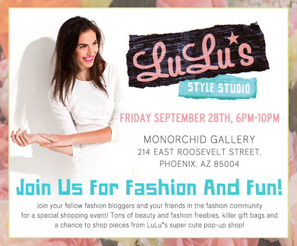 LuLu*s is throwing a free fashion event for fashion enthusiasts and bloggers! Join us at Monorchid in Phoenix on September 28th for tons of fashion and beauty giveaways, guest appearances from some of your favorite fashion bloggers, and a pop up shop featuring LuLu*s best Fall pieces!! This will be an evening of fashion and fun! Food, drinks and freebies! Giveaways from great sponsors such as EO, Orly, Goody, POP Beauty, Funk Off!, Umba Box, Radiant Cosmetics, Twistband, Black Sheep Clothing and more! Enjoy refreshing cocktails from POM and treats from Kind Snacks! Click here to register, for free!